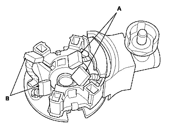12. Check for continuity between the (+) brushes (A) and the (-) brushes (B). If there is continuity, replace the brush holder assembly.