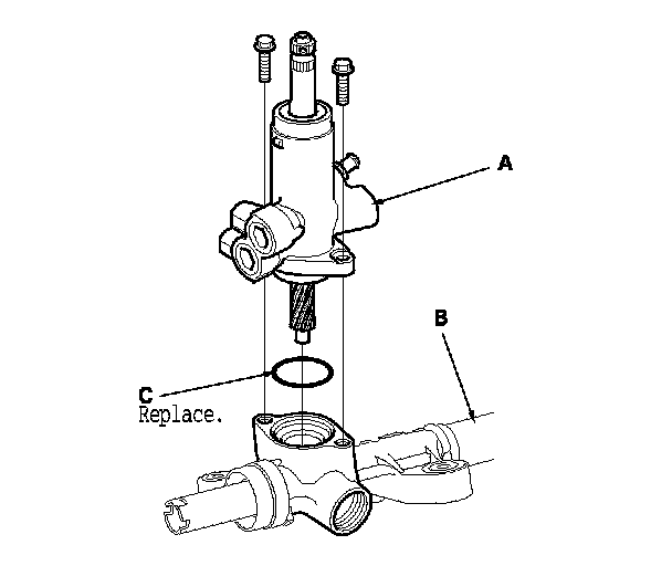 28. Using a cutter or an equivalent tool, cut the valve seal ring (A) and O-ring (B) at the cutting groove position (C) in the pinion shaft. Remove the valve seal ring and O-ring. Be careful not to damage the edges of the pinion shaft groove and outer surface when removing the valve seal ring and O-ring.