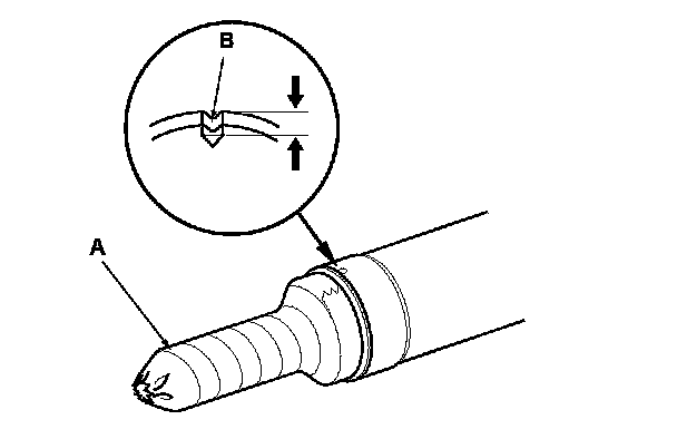 13. Drill a 4.0 mm (0.16 in) diameter hole about 2.5-3.0 mm (0.10-0.12 in) in depth in the staked point (B) on the cylinder. Do not allow metal shavings to enter the cylinder side on the gearbox housing. After removing the cylinder end, remove any burrs at the staked point.