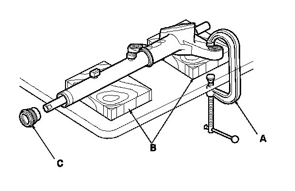 14. Hold the gearbox housing using a C-clamp (commercially available) (A) and the wooden blocks (B) to a work bench as shown. Do not clamp the cylinder part of the gearbox housing in a vise. Then remove the cylinder end (C).