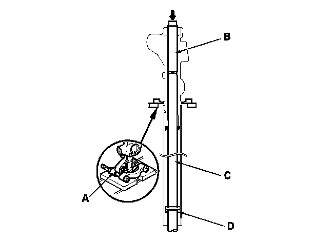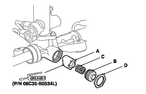 80. Remove the old sealant from the rack guide screw (B), then apply new sealant (Three Bond 1215 or Loctite 5699) to the middle of the threads. Install the spring (C), the rack guide screw and locknut (D).