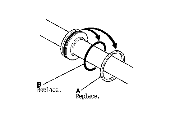 26. Remove the snap ring (A) and sleeve (B) from the pinion shaft (C).