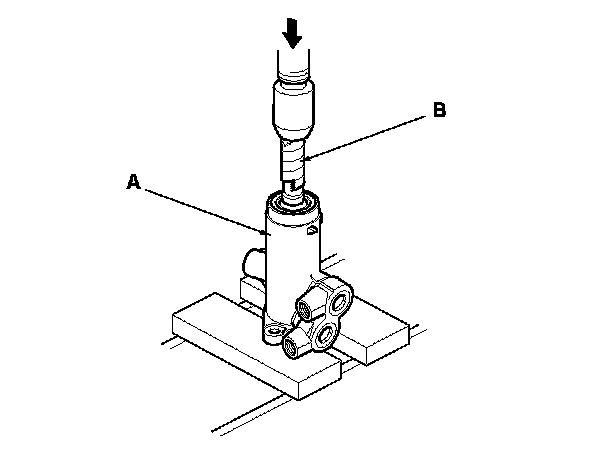 48. Apply power steering fluid to the seal ring lip of the new valve oil seal (A), then install the seal in the valve housing (B) using a hydraulic press, driver handle, and attachment. Install the seal with its grooved side facing the tool.