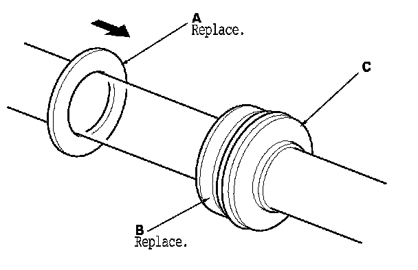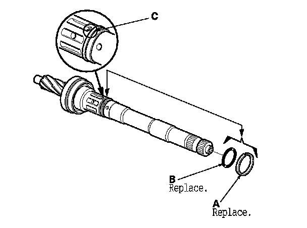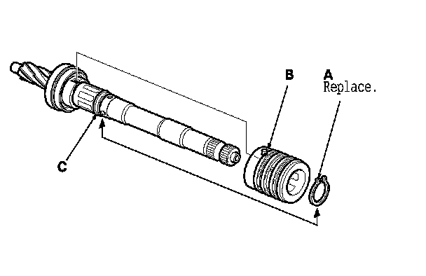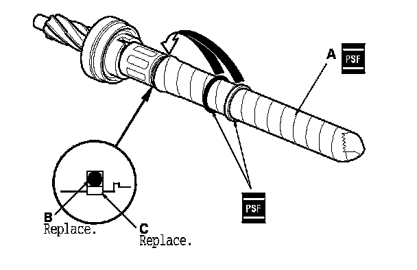 - Inspect the ball bearing (C) by rotating the outer race slowly. If there is any excessive play or wear, replace the pinion shaft and sleeve as an assembly.