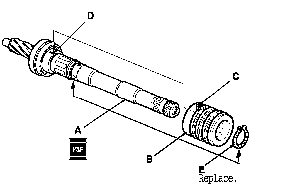 45. Apply power steering fluid to the surface of the pinion shaft (A). Slide the sleeve (B) onto the pinion shaft by aligning the locating pin (C) on the inside of the sleeve with the cutout (D) in the shaft. Then install the new snap ring (E) securely in the pinion shaft groove. Be careful not to damage the valve seal ring when inserting the sleeve.
