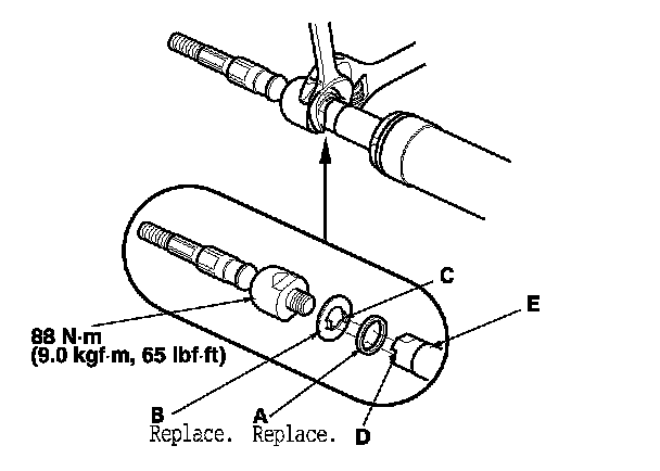 82. Install the new rubber stop (A) and the new lock washer (B). Align the lock washer tabs (C) with the slots (D) on the rack end (E) while holding the lock washer in place. Repeat this step for the other side of the rack shaft.