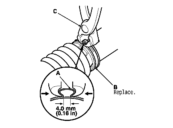 91. Close the ear portion (A) of the boot band (B) with a commercially available pincers, Oetiker 1098 or equivalent (C).