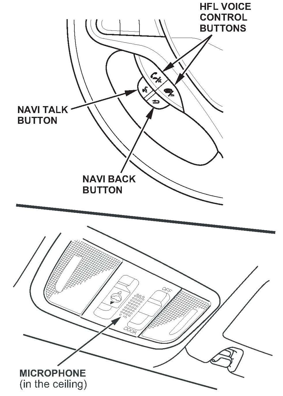The navigation system features a voice control system that allows you to operate most of the navigation, HVAC, and audio controls with only your voice. To interact with the navigation system, use the NAVI TALK and NAVI BACK buttons. The microphone is located on the ceiling. This is the primary way to give commands to the system.