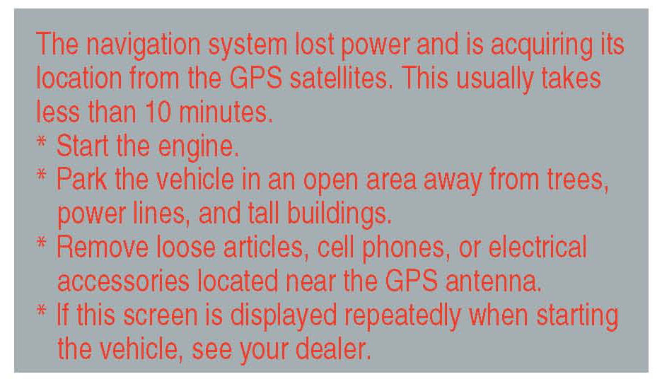 5. If the system does not initialize within 10 minutes, the screen (shown) appears. The system is still initializing but does not automatically exit to the screen above when initialization is complete. Do not immediately follow the instructions on the screen. After 30 minutes, try restarting the vehicle to see if the navigation system completed the initialization. If not, follow the instructions on the screen.