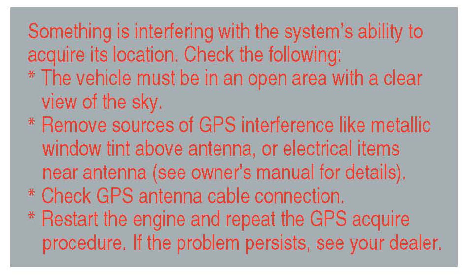 ^ The GPS antenna receives location information from orbiting satellites. Anything that blocks or interferes with the signal affects accuracy. The GPS signal can be blocked or interfered with (vehicle position shown incorrectly on the map) by: