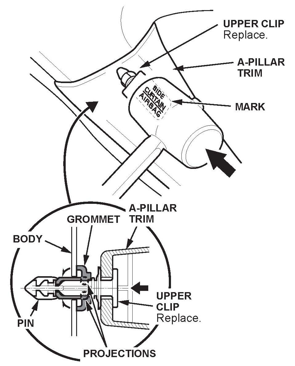 9. Hit the upper clip in the A-pillar trim with a rubber mallet. The clip is under the "SIDE CURTAIN AIRBAG" mark. Hitting the clip breaks the projections on the pin and pushes it into the grommet on the body.