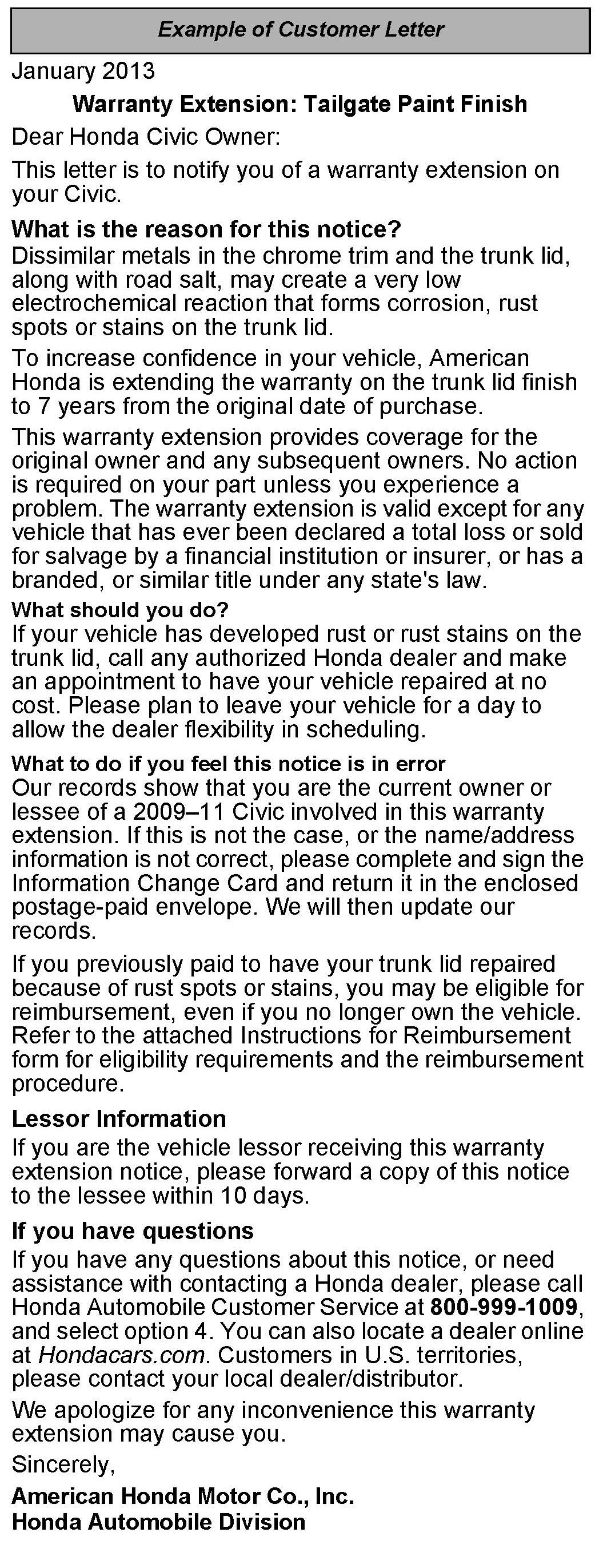 American Honda is extending the warranty on the trunk lid to 7 years from the original date of purchase.