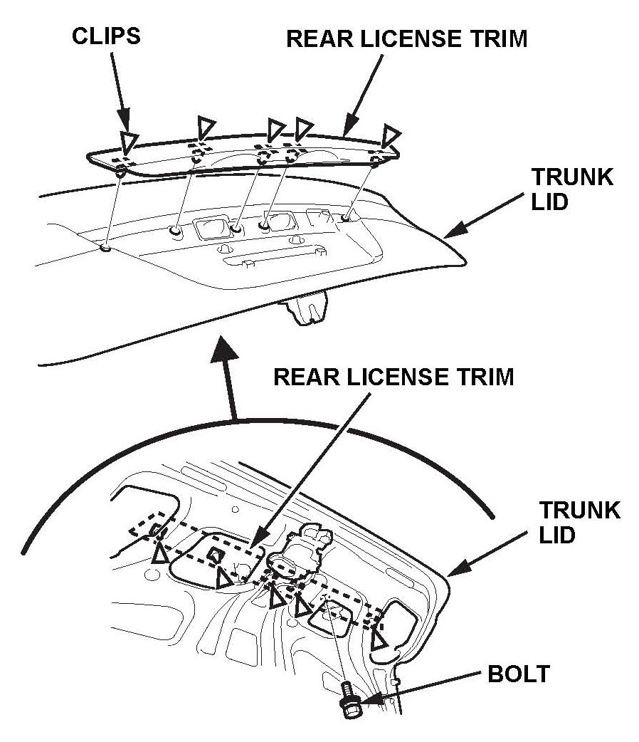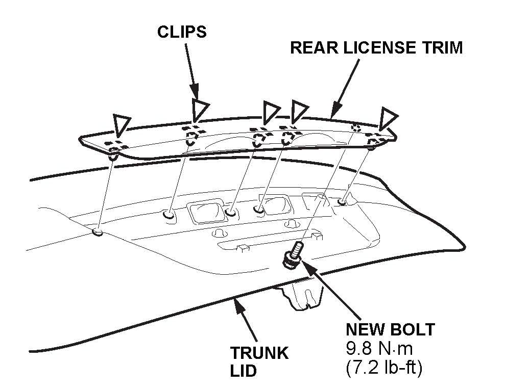 2. Remove the bolt securing the trunk lid lock cylinder. Detach the clips by pushing them through the holes in the trunk lid from the inside, then remove the rear license trim.