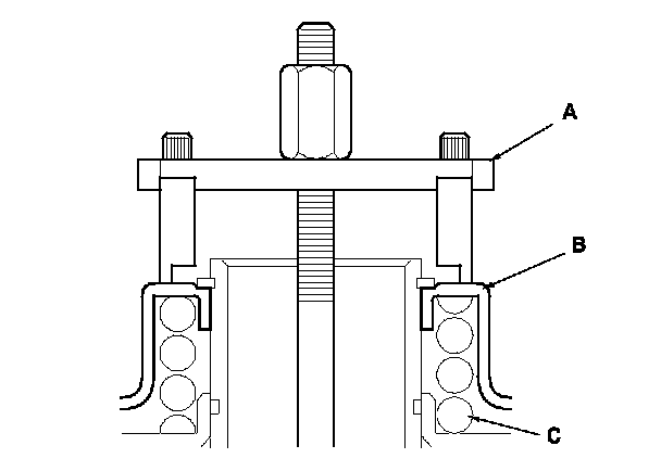 8. Set the clutch spring compressor (A) on the spring retainer (B) of the 1st clutch so that it pushes on the clutch return spring (C).