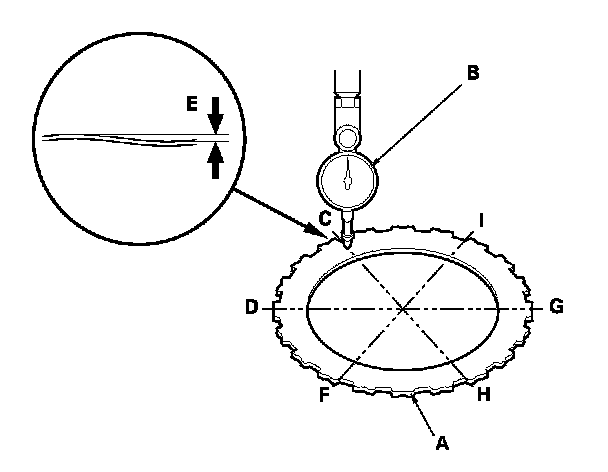 1. Place the clutch wave-plate (A) on a surface plate, and set a dial indicator (B) on the wave-plate.
