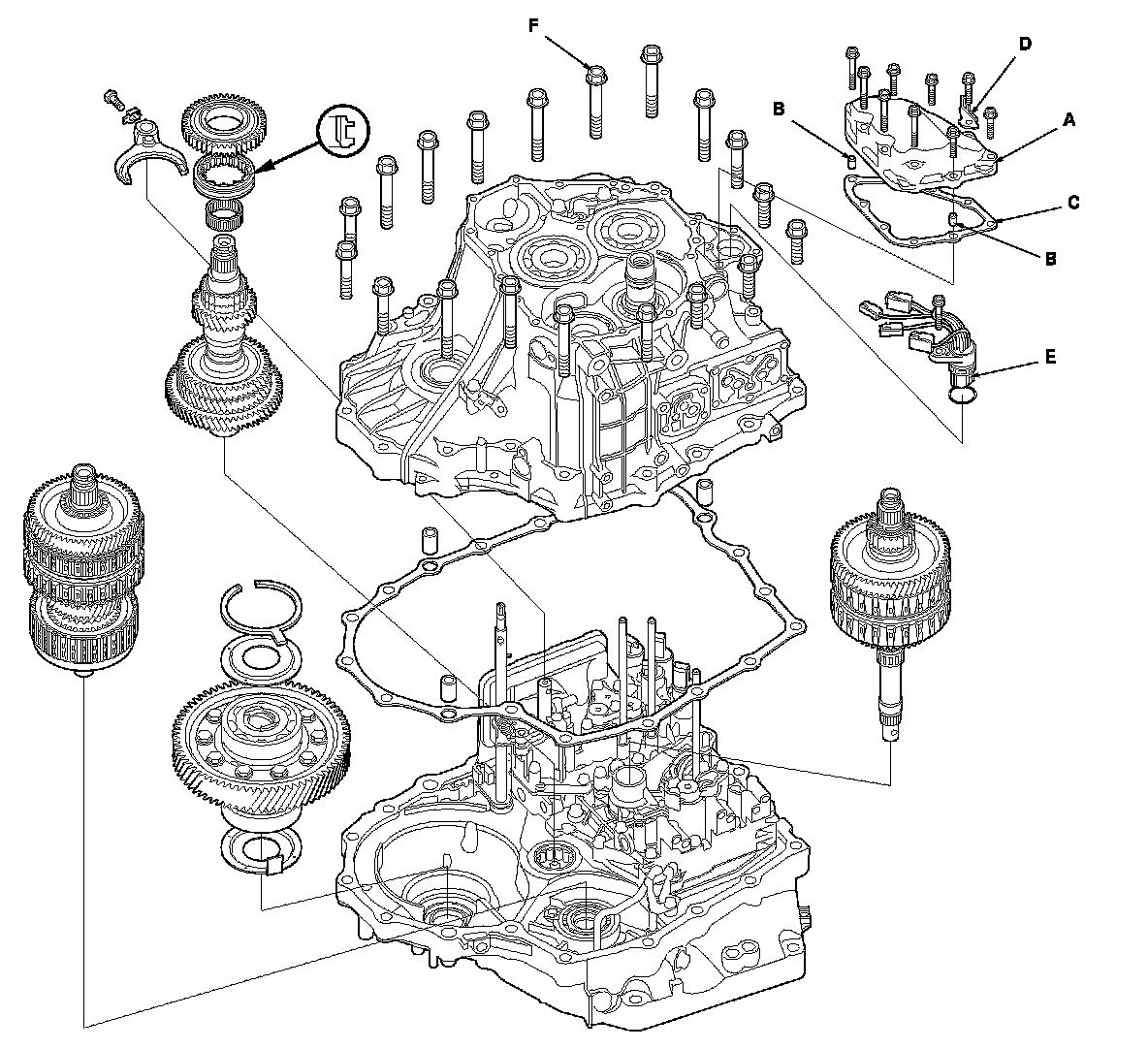 2. Disconnect the connectors from the shift solenoid valves, and remove the shift solenoid wire harness (E).