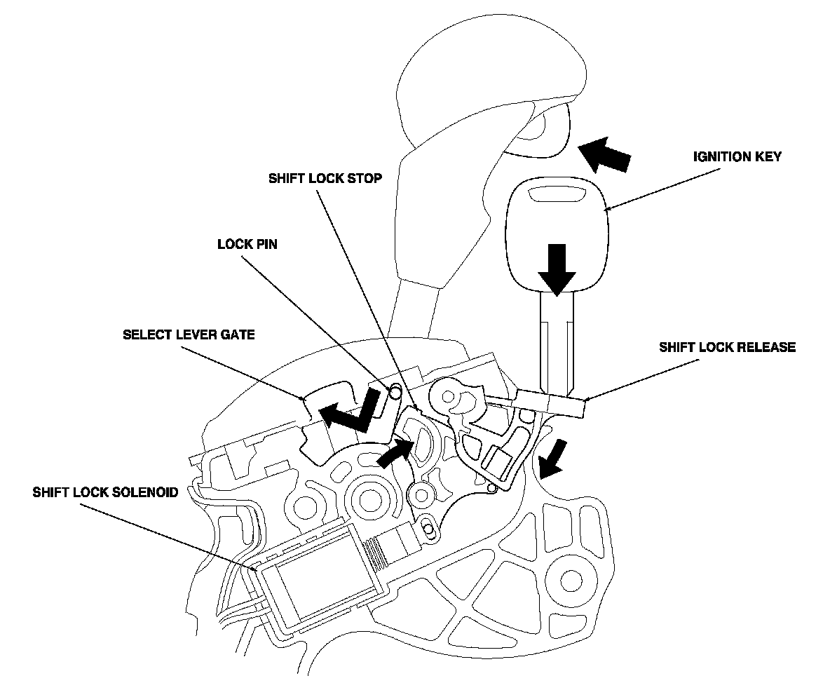 The shift lock system prevents the shift lever from mis-shifting. The shift lock solenoid is normally OFF. After starting the engine in P, the shift lever cannot move to any other position from P because the shift lock stop stops the lock pin unless certain conditions are met. When the brake pedal is pressed and the accelerator pedal is not pressed, the PCM commands the shift lock solenoid ON; the shift lock solenoid plunger in the shift lock solenoid pulls the shift lock stop to release the lock pin. Pressing the shift lever button allows the shift lever to move to any other position. When the brake pedal and the accelerator pedal are pressed at the same time, the PCM commands the shift lock solenoid OFF and the shift lock system is locked.
