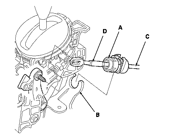 4. Rotate the socket holder retainer (A) counterclockwise, push it against the socket holder bracket (B), then slide the socket holder to remove the shift cable (C) from the bracket. Do not remove the shift cable by pulling the shift cable guide (D).