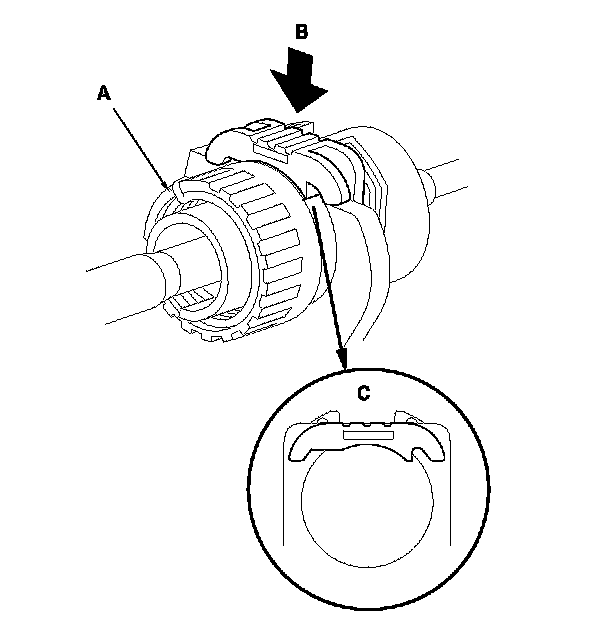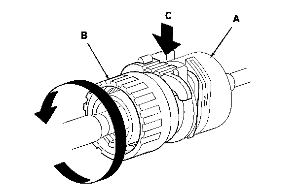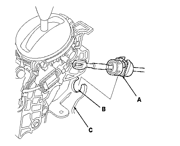 7. Rotate the socket holder retainer (A) clockwise, and push the socket holder lock (B). Rotate the holder retainer counterclockwise until the retainer stops at the stop (C) of the holder lock to secure the shift cable.