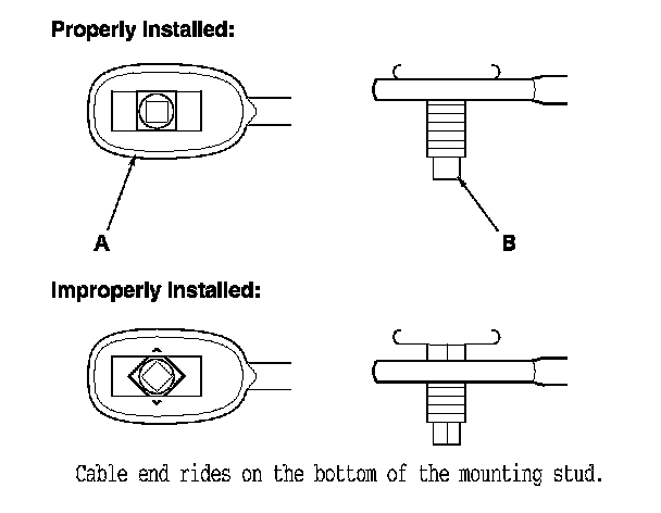 14. Make sure that the shift cable end (A) is properly installed on the mounting stud (B).