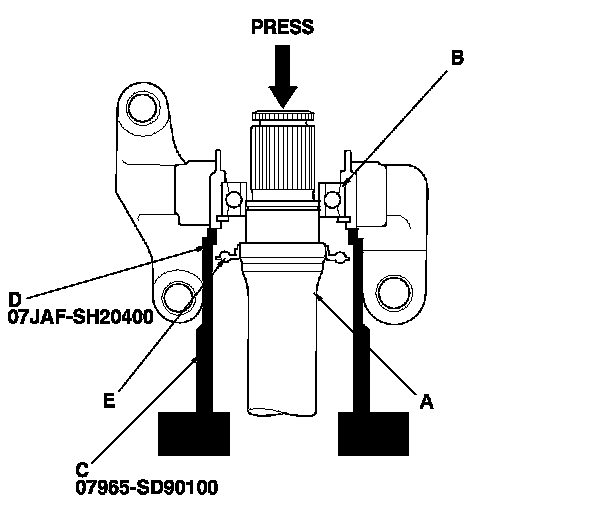 4. Press the intermediate shaft bearing (A) out of the bearing support (B) using the support base (C), the 44.5 mm oil seal driver (D), the support base attachment (E), and the press.