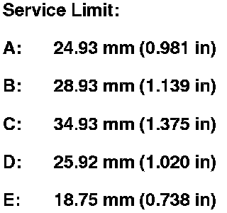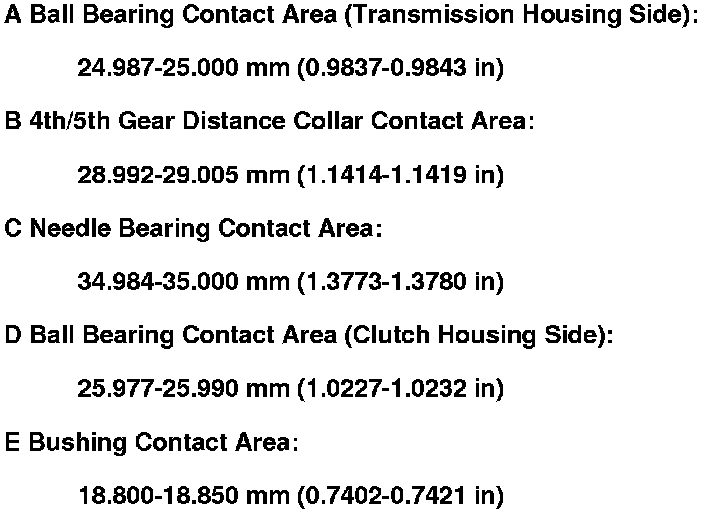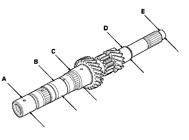 1. Inspect the gear and bearing contact areas for wear and damage, then measure the mainshaft at points A, B, C, D, and E. If any part of the mainshaft is less than the service limit, replace it.