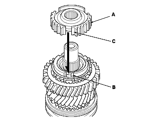 11. Install the 5th synchro hub (A) by aligning the synchro ring fingers (B) with the grooves (C) in the 5th synchro hub.