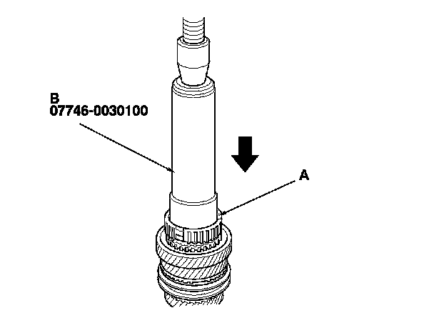 12. Press on the 5th synchro hub (A) using the 40 mm inner driver handle (B) and a press.