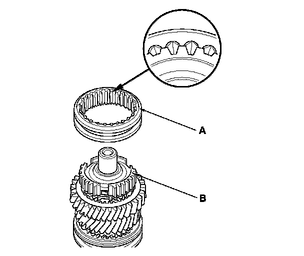13. Install the 5th synchro sleeve (A) by aligning the slots of the 5th synchro sleeve and the 5th synchro hub (B). After installing, check the operation of the 5th synchro hub set.