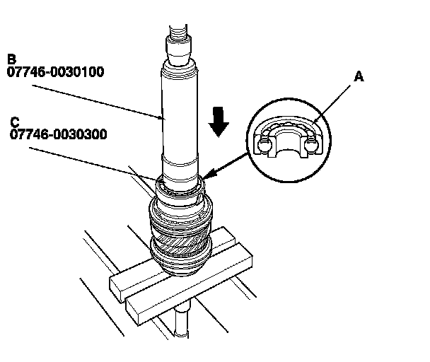 16. Press on a new angular ball bearing (A) using the 40 mm inner driver handle (B), the 30 mm inner bearing driver attachment (C), and a press.