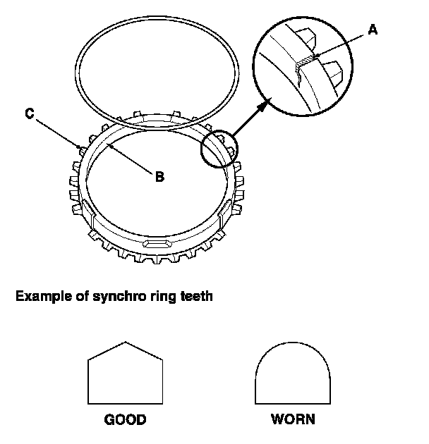 Inspect the teeth (C) on each synchro ring for wear (rounded off).