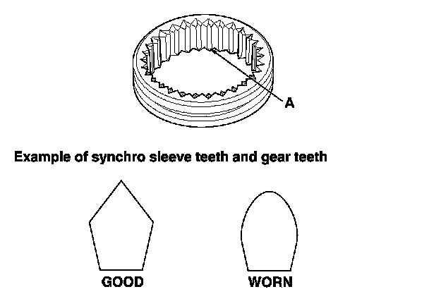 3. Inspect the teeth (A) on each synchro sleeve and matching teeth on each gear for wear (rounded off).