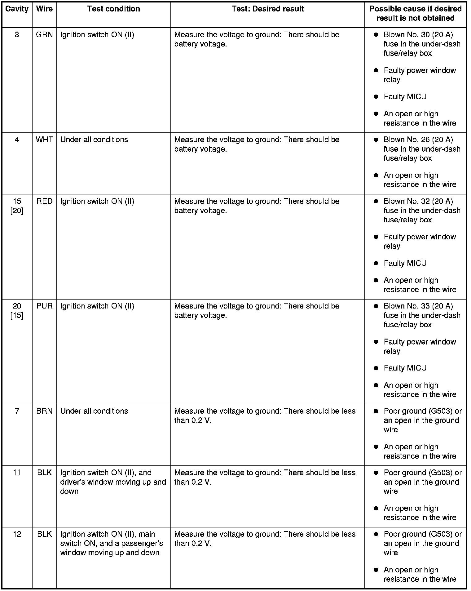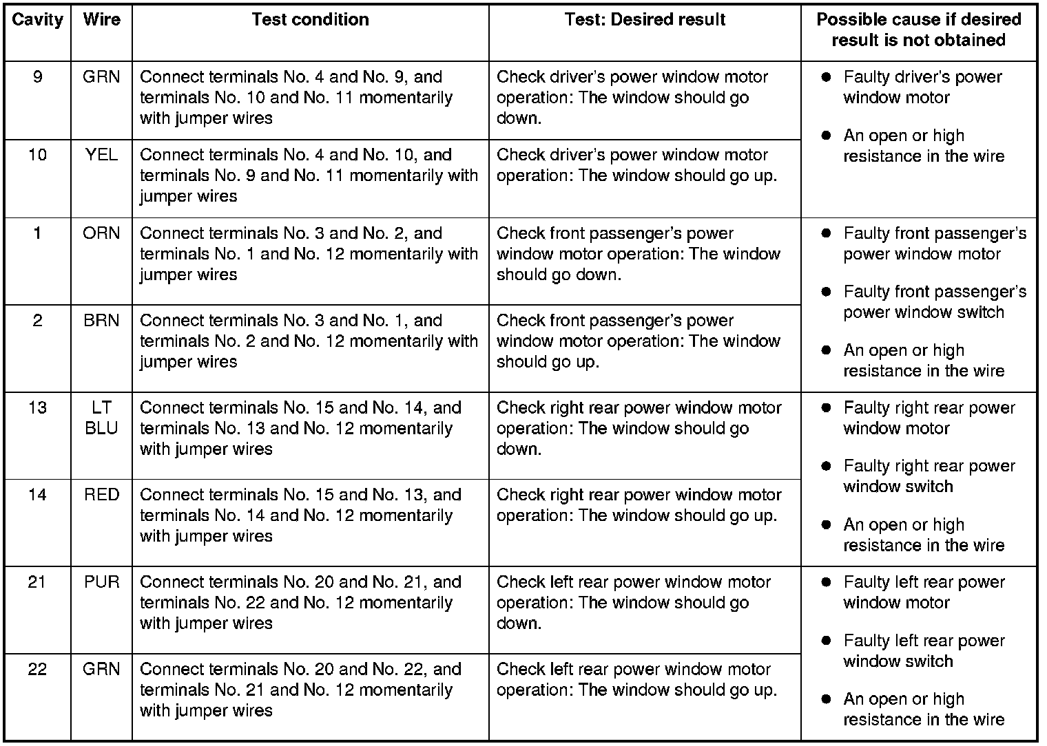4. With the power window master switch still disconnected, do the following input tests: