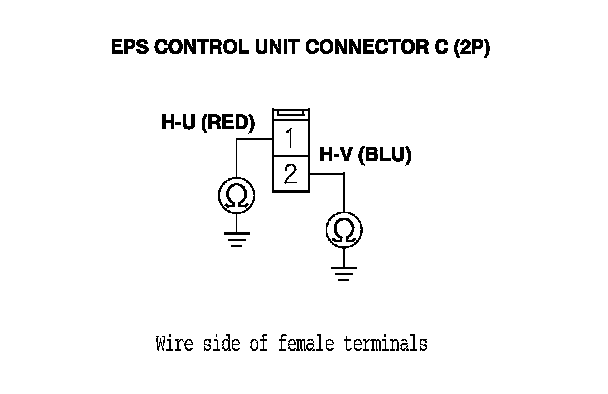 10. Check for continuity between body ground and EPS control unit connector B (2P) terminal No. 1, connector C (2P) terminal No. 1, and connector C (2P) terminal No. 2 individually.