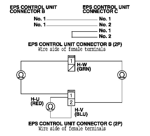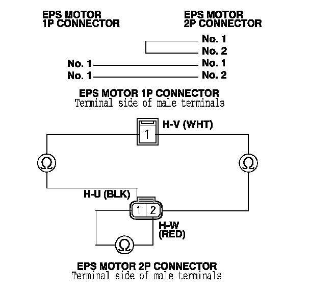 14. On the EPS motor side, check for continuity between the following terminals of the EPS motor 1P and the EPS motor 2P connector.
