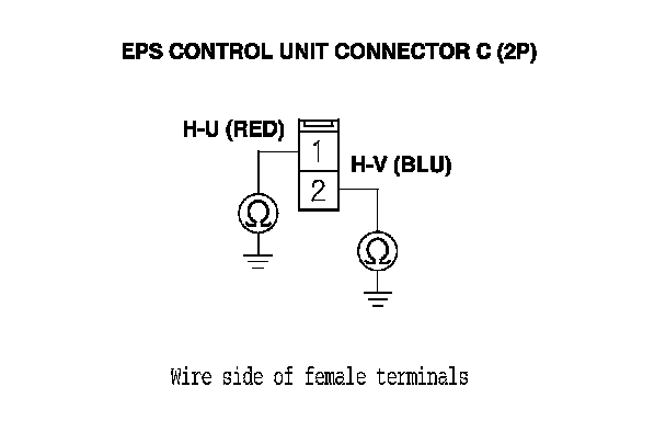 10. Check for continuity between body ground and EPS control unit connector B (2P) terminal No. 1, connector C (2P) terminal No. 1, and connector C (2P) terminal No. 2 individually.