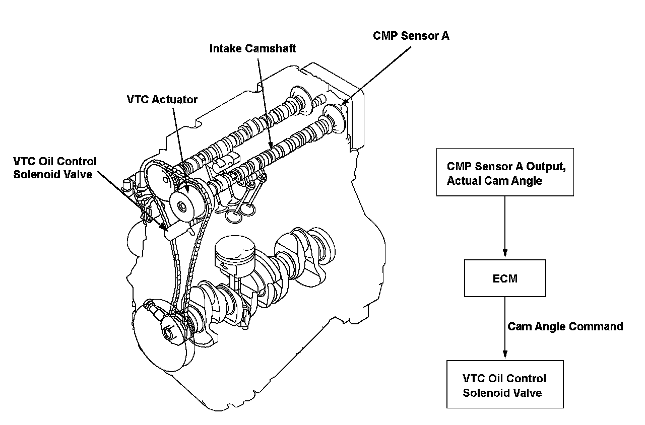 The variable valve timing control (VTC) system controls the timing of the intake camshaft. It uses oil pressure to operate the VTC actuator so the valve timing is optimized depending on driving conditions. The engine control module (ECM) monitors the phase control command and the actual timing of the camshaft by using camshaft position (CMP) sensor A. If the phase difference between them is excessive for a certain time period, the ECM detects a malfunction and stores a DTC.