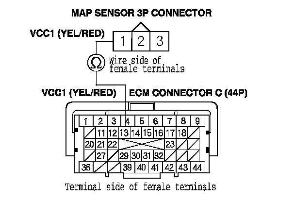 11. Check for continuity between ECM connector terminal C13 and MAP sensor 3P connector terminal No. 1.