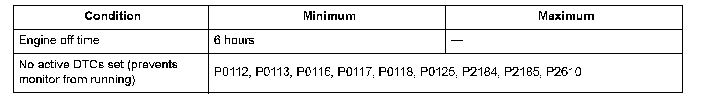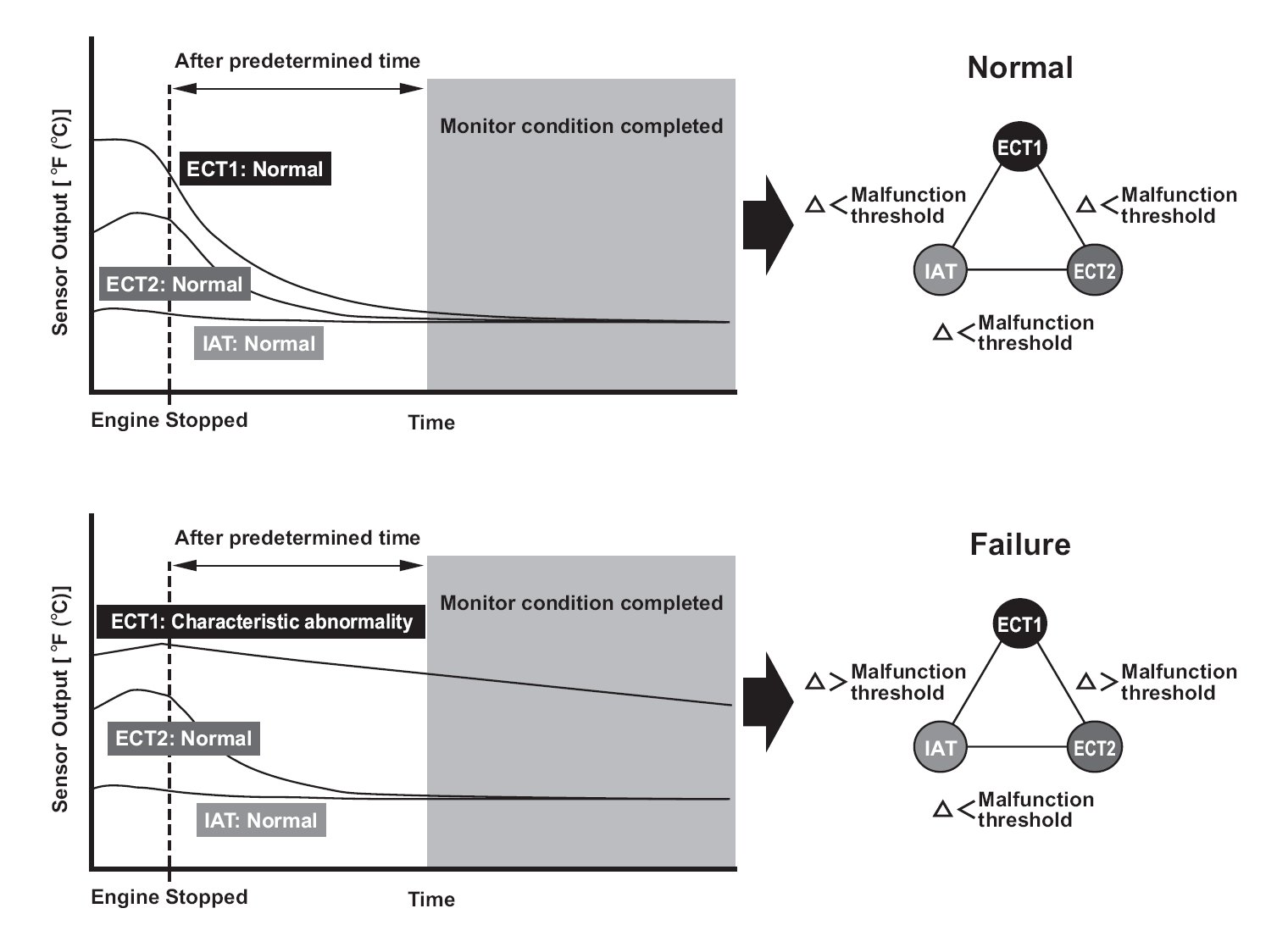 Two engine coolant temperature (ECT) sensors and one intake air temperature (IAT) sensor are used by the engine control module (ECM)/powertrain control module (PCM). When the engine is stopped and enough time has passed, the temperature of the engine will equalize to the ambient temperature. When an inappropriate temperature is detected after comparing the temperature readings of each sensor, the ECM/PCM detects a malfunction in the corresponding sensor and stores a DTC.