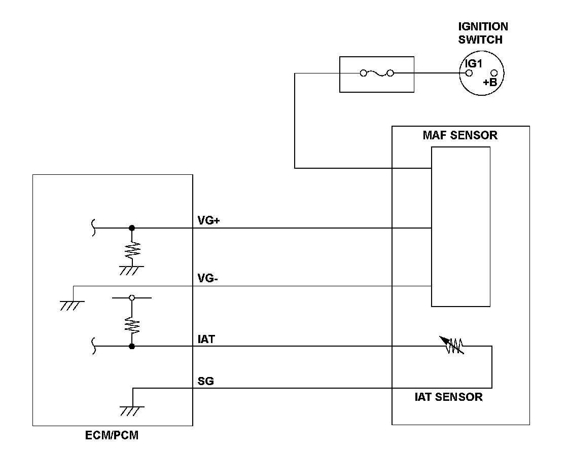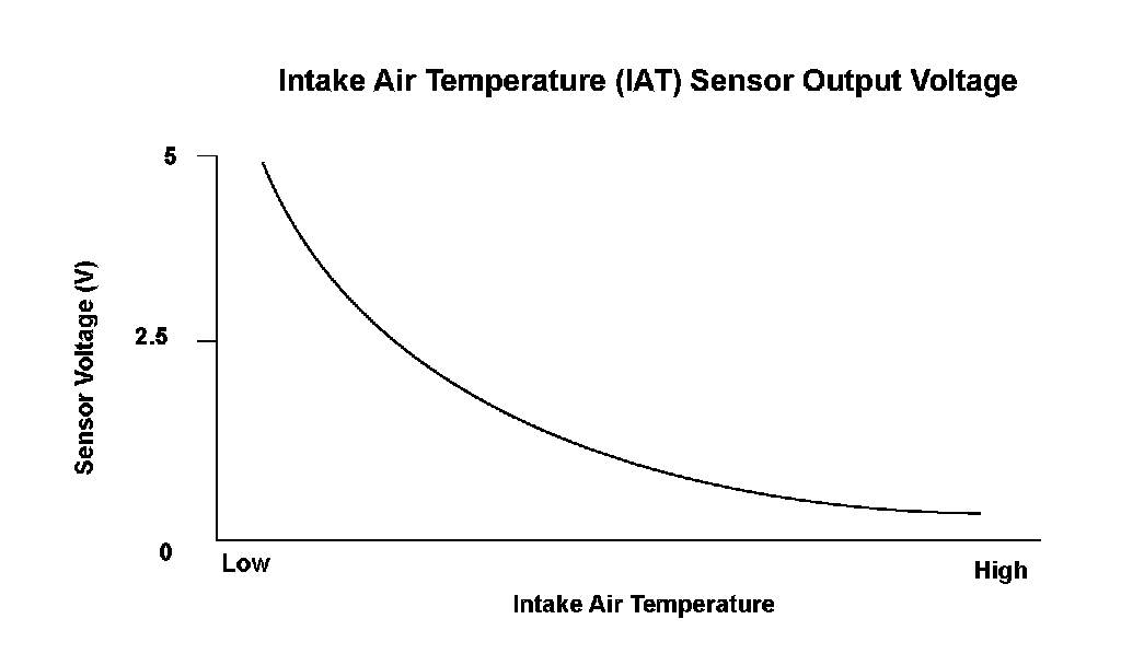 The intake air temperature (IAT) sensor is a thermistor that detects intake air temperature, and it is used for air/fuel ratio feedback control to compensate for the atmospheric density fluctuations that accompany changes in intake air temperature. The IAT sensor resistance varies depending on temperature. The output voltage and the sensor resistance increase as the intake air temperature decreases. Conversely, the output voltage and the sensor resistance decrease as the intake air temperature increases. If the IAT sensor output voltage is excessively low, the engine control module (ECM)/powertrain control module (PCM) detects a malfunction and stores a DTC.
