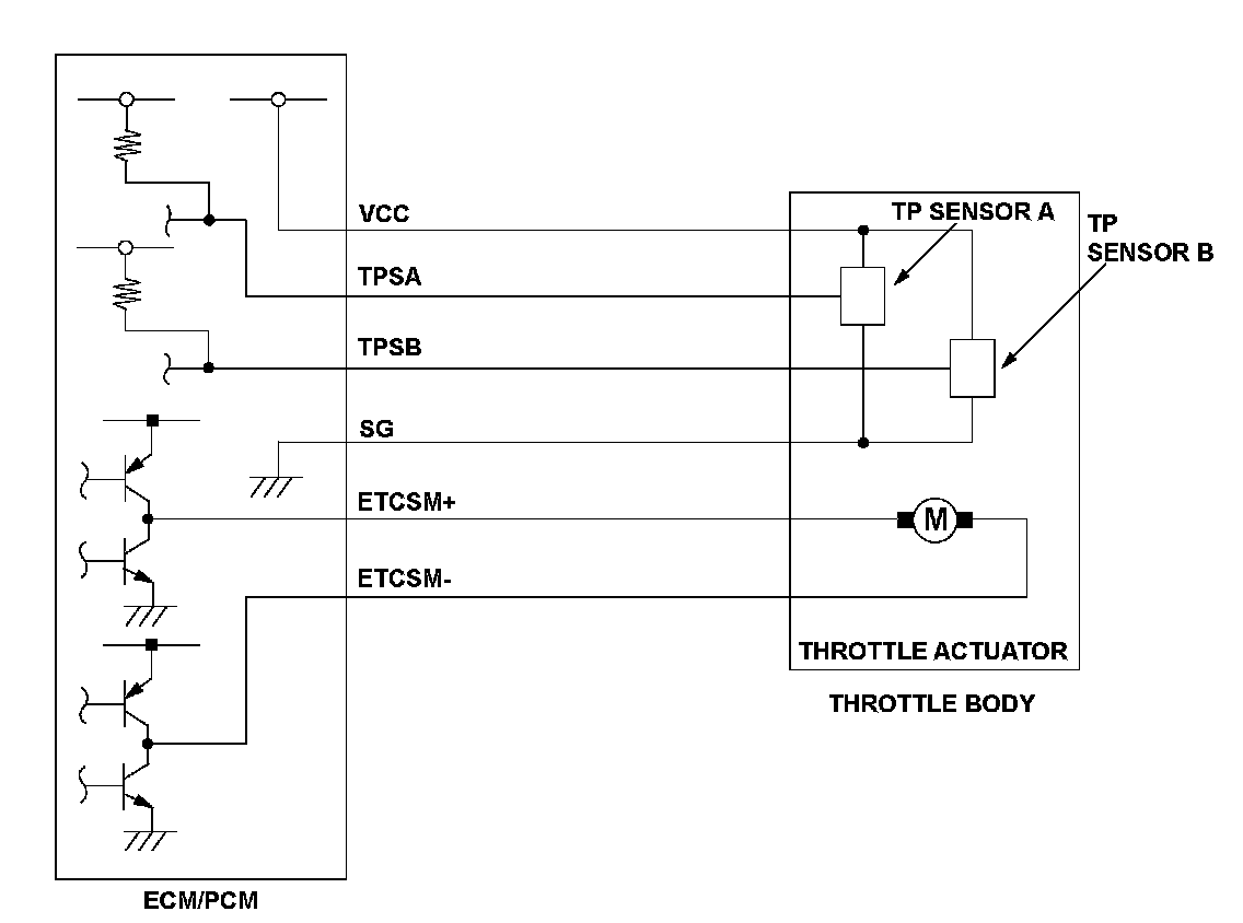 The electronic throttle control system controls the throttle valve opening. The system includes the throttle actuator, the throttle valve, throttle position (TP) sensors A and B, the electronic throttle control system (ETCS) control relay, the accelerator pedal position (APP) sensor, and the engine control module (ECM)/powertrain control module (PCM). TP sensor A is a semiconductor type, and it is attached to the throttle body and shaft to determine throttle valve position. The throttle valve position signal from TP sensor A is transmitted to the ECM/PCM for target position feedback control. If the signal from TP sensor A is a fixed value for a set time, the ECM/PCM detects a TP sensor A malfunction and stores a DTC.