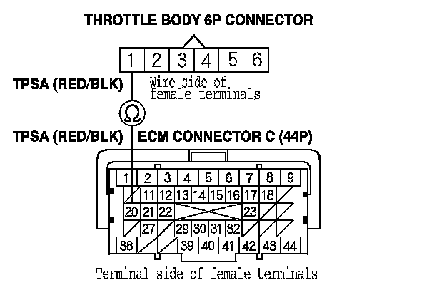 17. Check for continuity between ECM connector terminal C39 and throttle body 6P connector terminal No. 4.