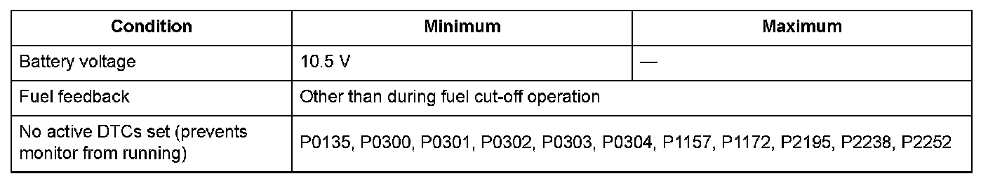 - The A/F sensor internal resistance value is 70 Ohms or more for at least 15 seconds.