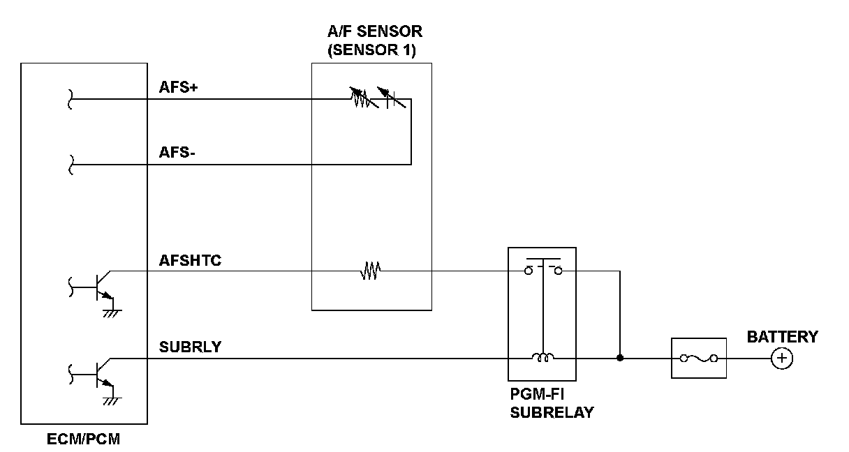 A heater for the sensor element is embedded in the air/fuel ratio (A/F) sensor (sensor 1), and it is controlled by the engine control module (ECM)/powertrain control module (PCM). It is activated and heats the sensor to stabilize and speed up the detection of oxygen content when the exhaust gas temperature is cold. If the A/F sensor (sensor 1) heater current is not a set value, or the heater is overheated, a malfunction is detected and stores a DTC.