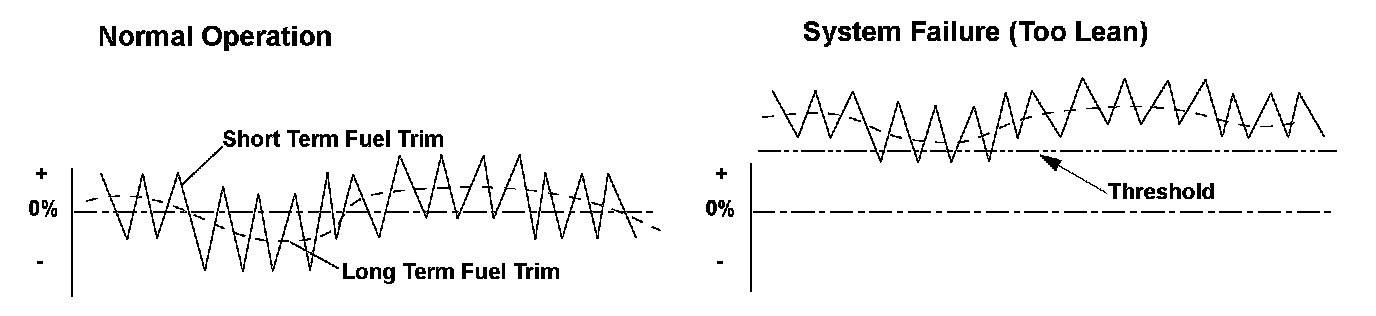 The engine control module (ECM)/powertrain control module (PCM) detects the oxygen content in the exhaust gas from the air/fuel ratio (A/F) sensor (sensor 1) signal voltage, and it uses fuel feedback control to maintain the optimal air/fuel ratio. The air/fuel ratio coefficient for correcting the amount of injected fuel is the short term fuel trim. The ECM/PCM varies short term fuel trim continuously to keep the air/fuel ratio close to the stoichiometric ratio for all driving conditions. Long term fuel trim is computed from short term fuel trim and is used to regulate long term deviation from the stoichiometric air/fuel ratio, which occurs when fuel metering components deteriorate with age or system failures occur. In addition, long term fuel trim is stored in the ECM/PCM memory and is used to determine when fuel metering components malfunction. When long term fuel trim is higher than normal, which is about 1.0 (0 %), the amount of injected fuel must be increased, and when lower than normal, it must be decreased. If long term fuel trim is higher than normal (too lean), the ECM/PCM detects a malfunction in the fuel metering components and stores a DTC.