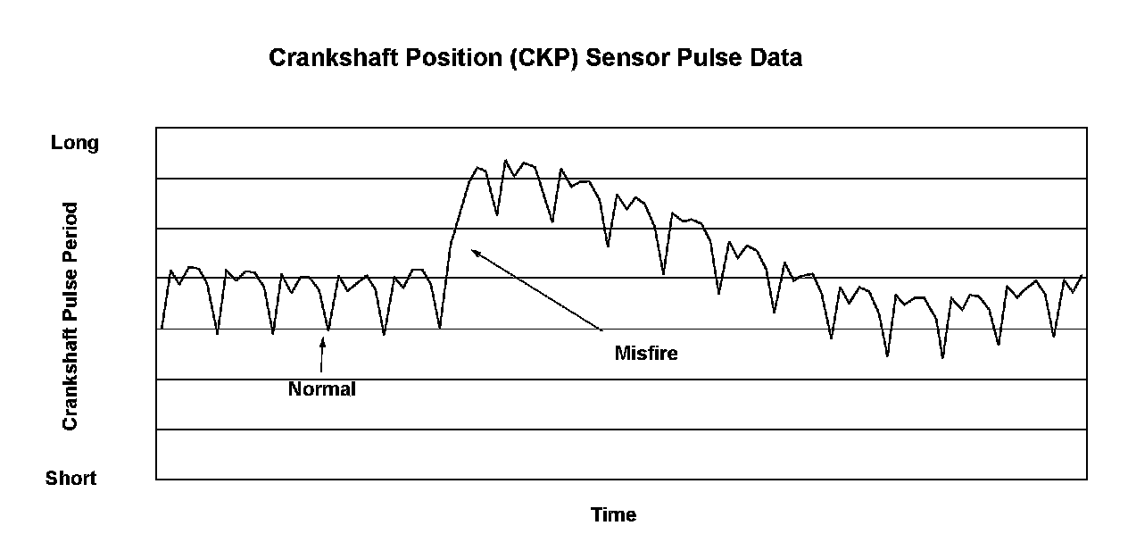 The crankshaft vibrates slightly when each cylinder fires. If a misfire occurs, the crankshaft rotation speed changes rapidly. The engine control module (ECM) monitors the crankshaft rotation speed based on the output pulses from the crankshaft position (CKP) sensor. By monitoring changes in the crankshaft rotation speed, the ECM counts the number of misfires and determines which cylinder is misfiring. If more than one DTC from P0301 through P0304 has been stored while misfires in multiple cylinders are detected, a malfunction is detected and a DTC is stored.