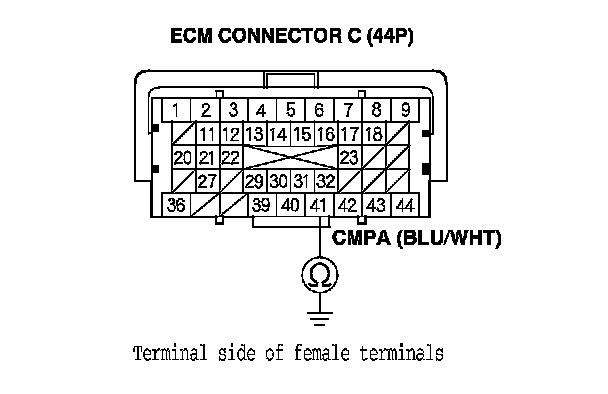 14. Check for continuity between ECM connector terminal C41 and body ground.