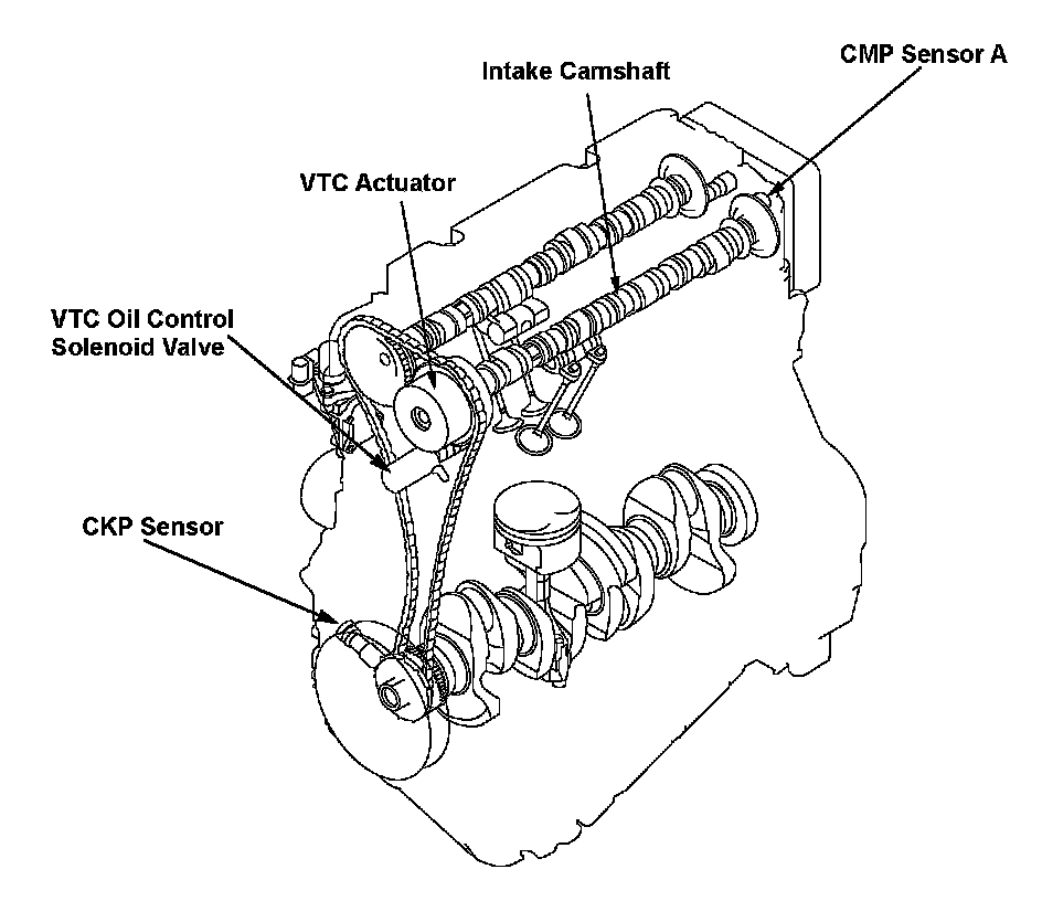 Camshaft position (CMP) sensor A detects the intake camshaft timing and sends pulsing signals to the engine control module (ECM). The ECM determines the advance or the retard of the camshaft timing according to the signals from the crankshaft position (CKP) sensor and CMP sensor A. If the pulse deviates from a set range over a specified time period while the variable valve timing control (VTC) is not activated, or the timing of the camshaft deviates from a set range over a specified time period while the engine is running with the VTC activated, the ECM detects a malfunction and stores a DTC.