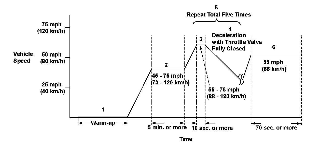 2. Drive the vehicle at a speed between 45 - 75 mph (73 - 120 km/h) for at least 5 minutes, to warm up the TWC.