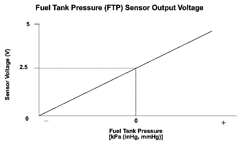 The fuel tank pressure (FTP) sensor is installed on the evaporative emission (EVAP) canister and detects the fuel tank pressure. The FTP sensor is used to detect leaks in the EVAP system. The engine control module (ECM) monitors the FTP sensor output voltage. The FTP sensor output voltage rises as the fuel tank pressure increases. Conversely, the FTP sensor output voltage drops as the fuel tank pressure decreases. If the FTP sensor output voltage does not reach a target value for a set time after starting the engine in a cold condition, the ECM detects a malfunction and stores a DTC.